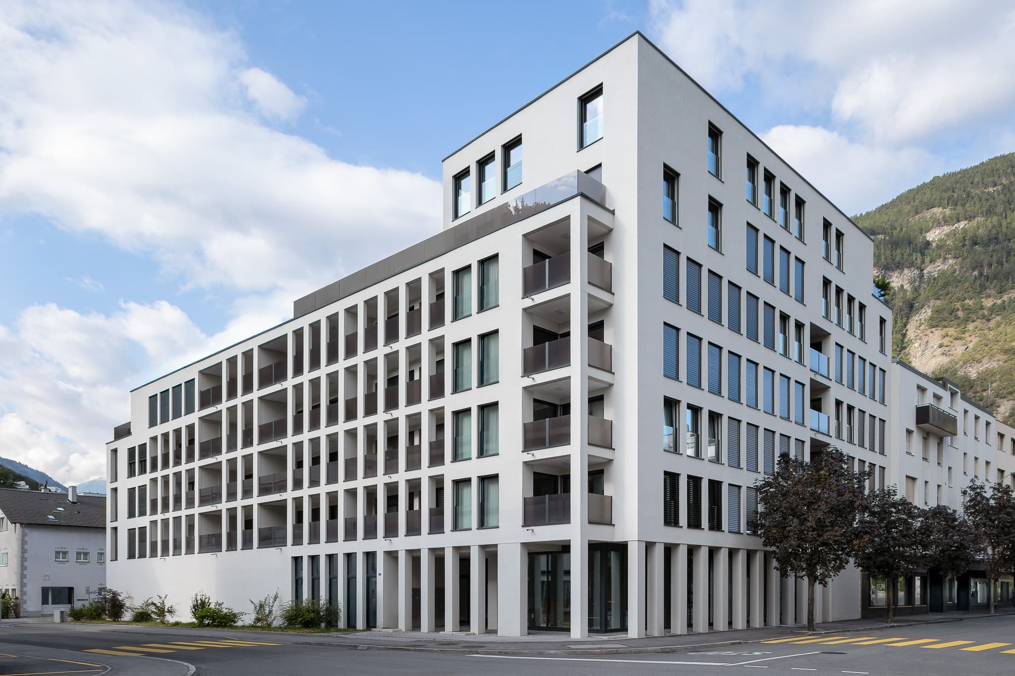 Im Erdgeschoss entstand eine Geschäftsfläche, die seit September 2025 unser neuer Bürostandort in Visp ist. Das Parking erstreckt sich über die zwei unteren Geschosse, während in den Obergeschossen 39 Wohnungen mit jeweils grosszügigen Terrassen realisiert wurden. Durch die unterschiedlichen Gebäudehöhen, bedingt durch verschiedene Bauzonen, entstanden mehrere Attikawohnungen.