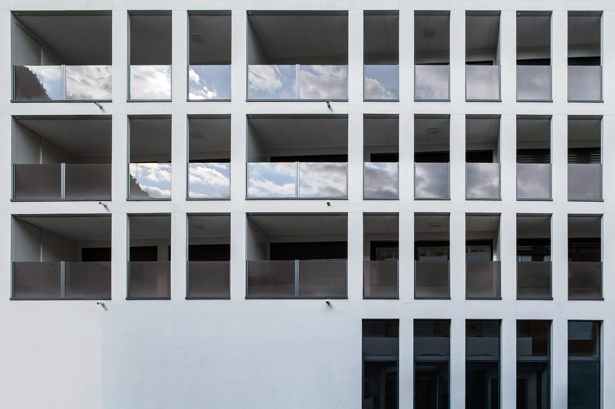 Die Fassade folgt einem klaren Raster, das sich über Fenster, Terrassen und Stützen durchzieht und dem Gebäude eine ruhige und strukturierte Erscheinung gibt. Die blickdichten Balkongeländer aus Glas verleihen dem Gebäude eine moderne, geschlossene Optik und bieten den Bewohnern Privatsphäre.